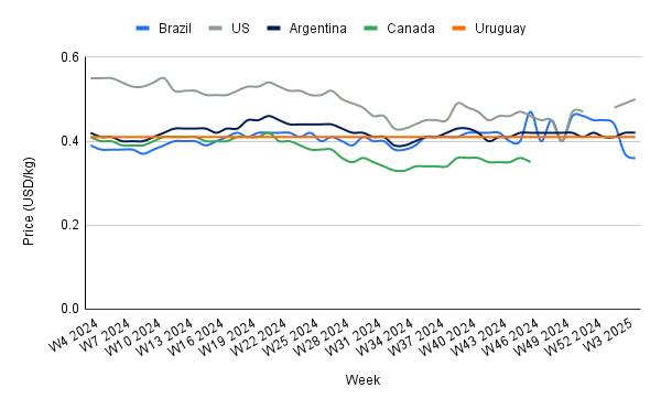 In W4, Uruguay's soybean prices held steady at USD 0.41/kg, supported by key factors such as favorable market conditions and the expansion of planting area. For the 2024/25 MY, Uruguay's soybean planting area is projected to reach 1.3 million ha, a 19% increase from the five-year average. This growth is attributed to late-season soybean planting as producers brace for potential challenges from the La Niña weather pattern. The USDA forecasts Uruguay's soybean production for 2024/25 at 3.4 mmt, up from 3.2 mmt in the previous year due to favorable weather conditions.
