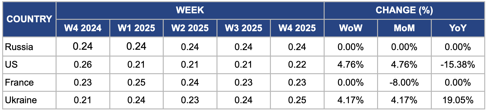 In W4, Brazilian soybean prices fell by 2.70% week-on-week (WoW), 20% month-on-month (MoM), and 7.69% YoY, reaching USD 0.36 per kilogram (kg). This price decline comes amid the Brazilian Association of Vegetable Oil Industries (ABIOVE) projecting a record soybean harvest of 171.7 mmt for 2025, an increase of 3 mmt from Dec-24's forecast. This marks an 11.9% rise compared to the 2024 season. Export expectations for Brazil have also been upgraded, with a historic level of 106.1 mmt anticipated, a 7.4% increase compared to 2024. Moreover, soybean processing in Brazil is expected to reach a record 57.1 mmt in 2025, with soybean meal and oil production projected to grow by 3.8% and 3.6%, respectively, compared to 2024.