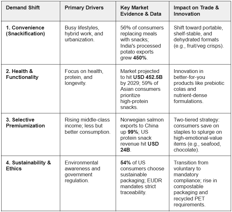 In 2025, global food demand experienced structural transformation as consumers increasingly prioritized convenience, health, premiumization, and sustainability over price and quantity alone. These shifts are driven by urbanization, rising middle-class incomes, and growing environmental and health awareness, particularly in Asia, Africa, and Europe. As a result, global agri-food trade is increasingly pivoting towards snacks, functional foods, plant-based ingredients, premium products, and sustainable packaging inputs. Looking ahead, global food demand is expected to remain anchored around these four dominant forces, convenience, health and functionality, premiumization, and sustainability. These drivers will increasingly manifest through deeper structural shifts, sustained product innovation, and packaging-led differentiation across the agri-food value chain.