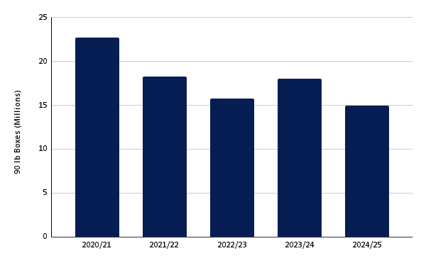 Key production metrics indicate underlying challenges in the sector. The number of bearing trees has fallen, with non-Valencia trees decreasing by 17% and Valencia trees by 11%. For non-Valencia oranges, the estimated fruit per tree has risen to 392 pieces, an improvement over last season, but fruit size is still below the minimum threshold, requiring 344 pieces to fill a standard 90-pound (lb) box. For Valencia oranges, fruit per tree has decreased significantly to 244 pieces, the lowest since the 1964–65 season, with an estimated 266 pieces required to fill a 90-lb box. Projected fruit drop rates are concerning, with 31% for non-Valencia and 38% for Valencia.