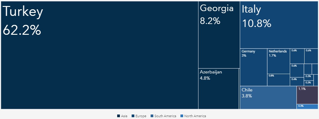 Turkey, Italy, and the U.S. are the top 3 producers of hazelnut. According to Tridge, despite a 35% decrease in production brought by frost on the Black Sea coast, Turkey garnered 56.5% of global hazelnut production in 2016. As Turkish hazelnut production fell, Italy and the U.S. expanded their production by 18.6% and 22.6% in the same year. Italy harvested 120,600 tonnes, while the U.S. cultivated 34,500 tonnes.