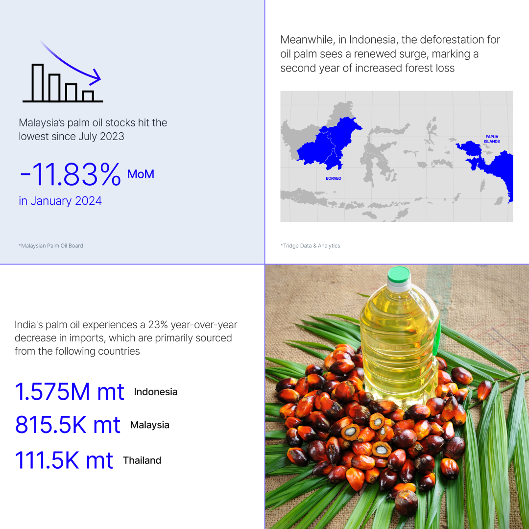 W7 Palm Oil Update: Malaysian Palm Oil Stocks in Jan-24 Plummet to Lowest Since Jul-23