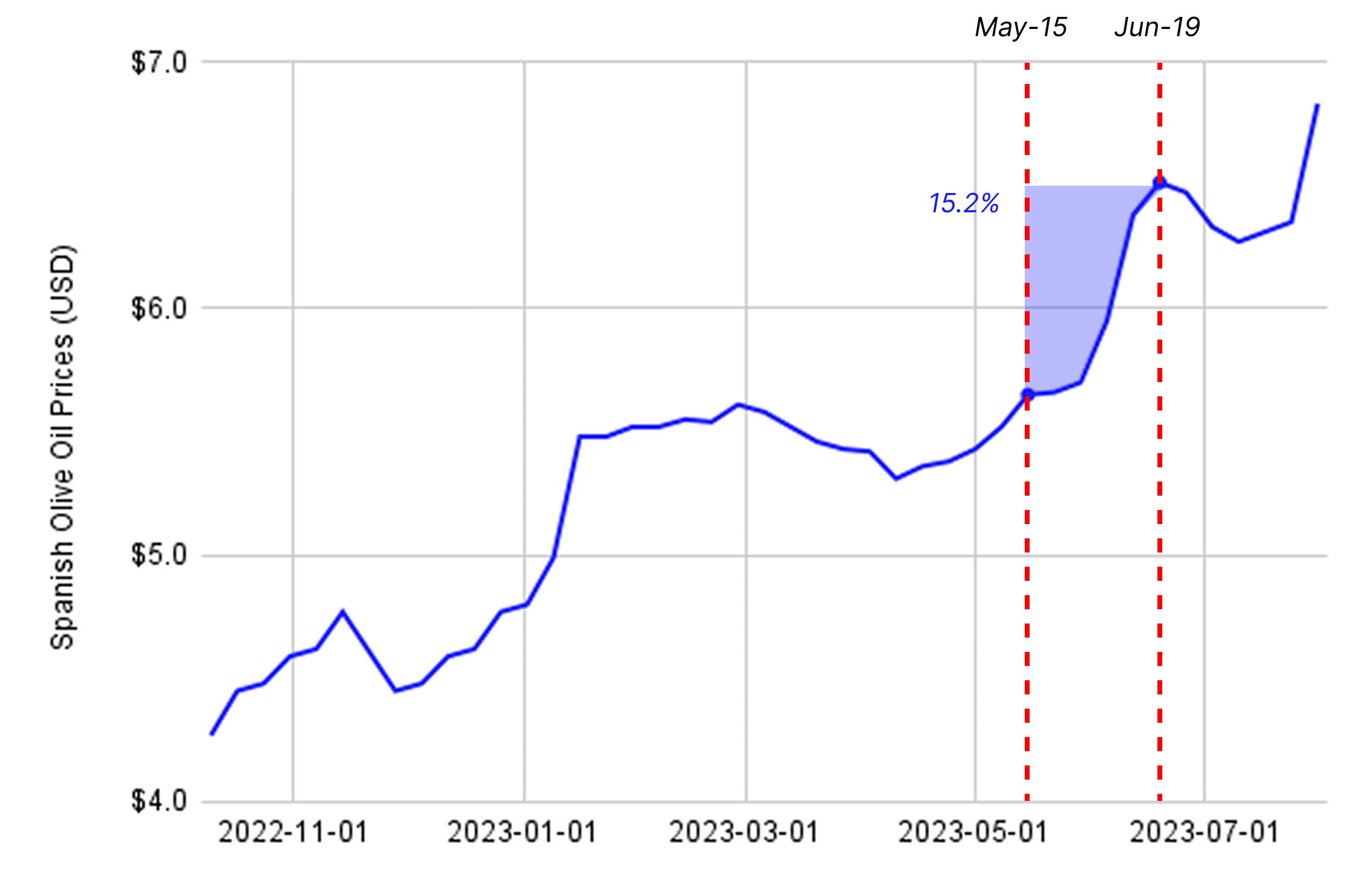 Producing half of the world's supply of olive oil, Spain has a significant influence on global olive oil prices since it is the leading producer and exporter. Since Jun-20, prices have risen due to increasing production costs and growing demand. High-interest rates and inflation increased fertilizer and energy costs, and the global shortage of sunflower oil after the invasion of Ukraine drove demand higher. However, the recent production decline has made global olive oil prices spike to new levels. According to the International Monetary Fund, export prices of global extra virgin olive oil were 6,269 USD per metric ton (mt) at the end of April, breaking the 26-year record in 1996 when it was traded at 6,225 per mt. According to Tridge, Spain’s olive oil was traded at 6.51 USD/kg on June 19, a 15.2% month-on-month (MoM) increase.