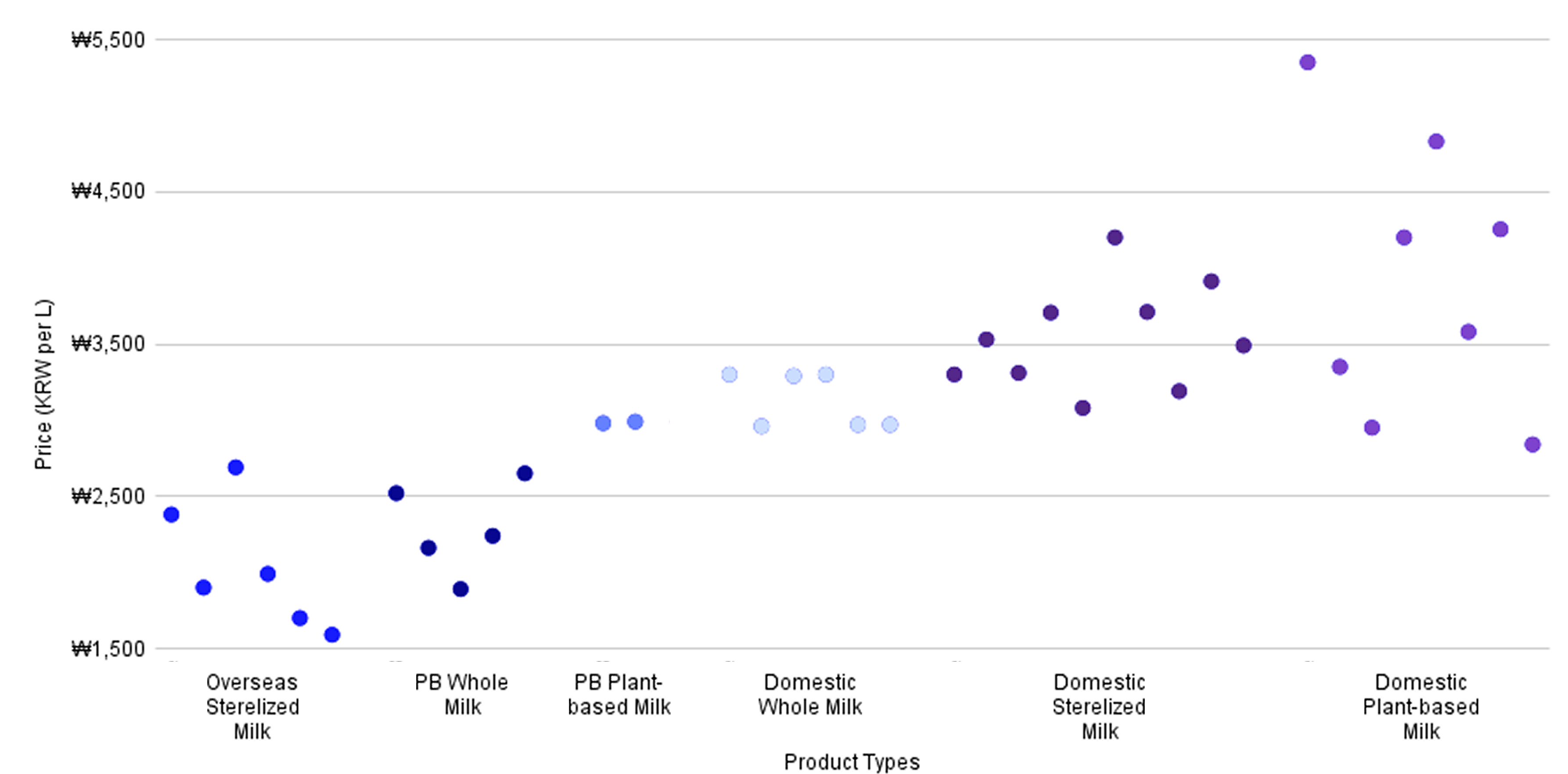 As depicted on the graph, overseas sterilized milk and PB milk products are priced much lower, remaining in the price range of KRW 1,500/L (USD 1.09/L) to KRW 2,700/L (USD 1.97/L), while domestic sterilized milk hovers above KRW 2,900/L (USD 2.12/L). This positions PB whole milk and overseas sterilized milk as competitors for price-sensitive consumers, and domestic whole milk is pushed into the lower price range of plant-based milk.