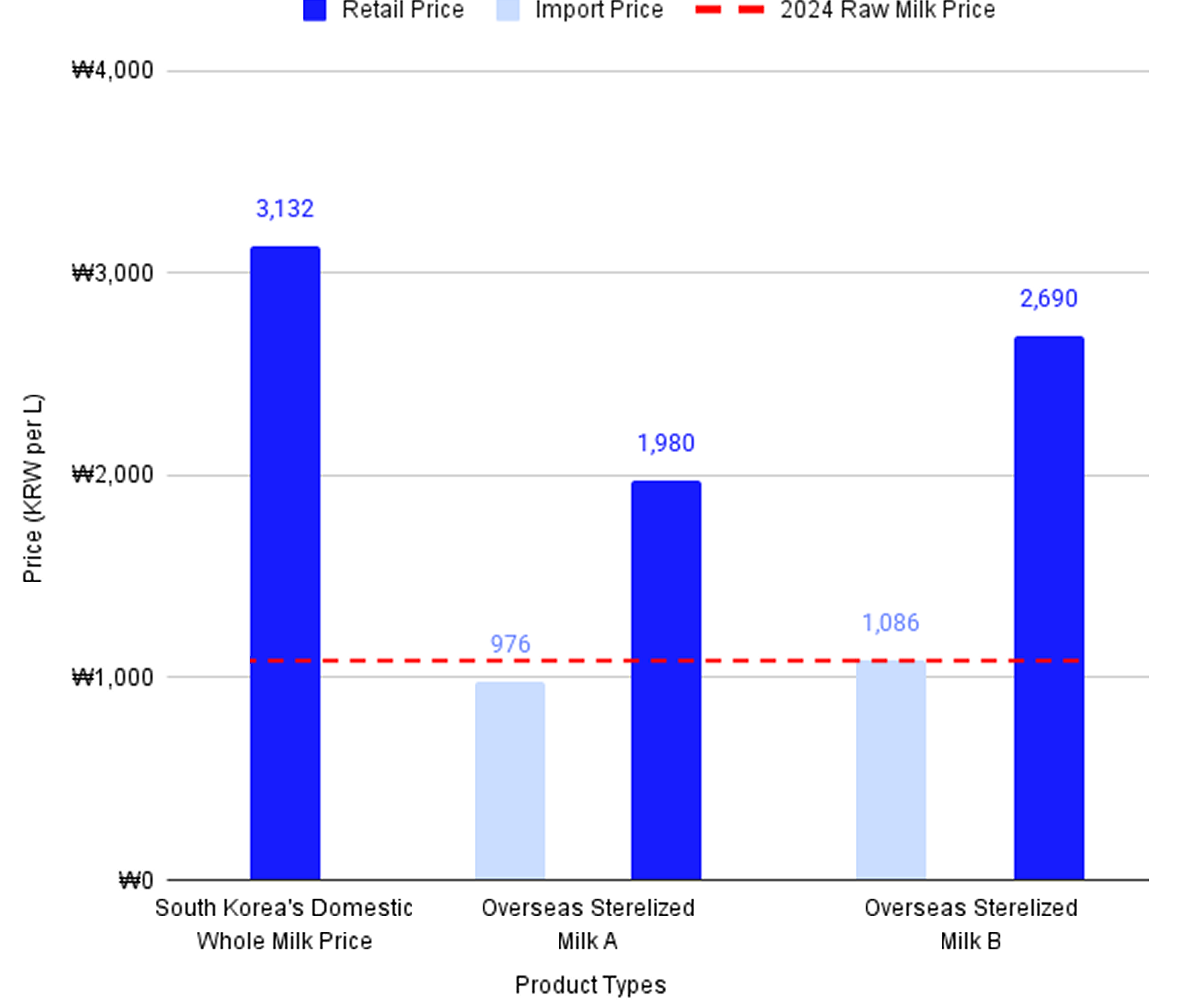 The bar graph below depicts the comparison between (1) the import price of overseas sterilized milk, (2) the corresponding retail price per liter(L), (3) South Korea’s raw milk price set by the Dairy Promotion Association and (4) the average retail price of South Korea’s domestic whole milk products.