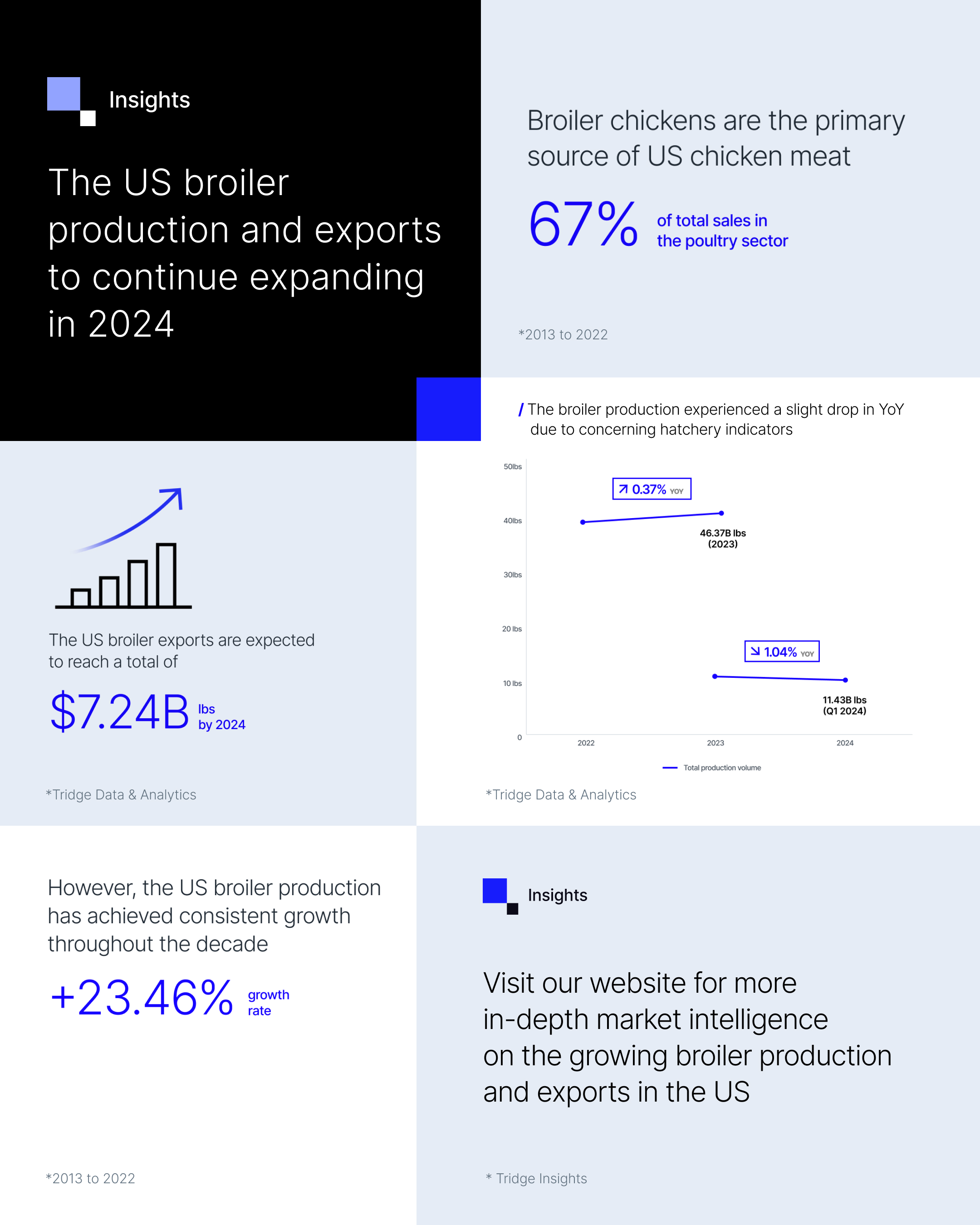 However, US broiler production is expected to reach 11.43 billion lbs in Q1-2024, a slight 1.04% drop compared to Q1-2023. This pessimistic outlook is attributed to bleak hatchery indicators. The USDA’s National Agricultural Statistics Service (NASS) Chickens and Eggs report indicated that there were 681.5 million broiler-type eggs in incubators at the start of Nov-23, a drop of 3.7% compared to the same period in 2022 but close to the five-year average. Notably, broiler-type eggs in incubators on the first of each month in 2023 have dropped consistently since Jun-23. During the week ending December 23, 2023, US hatcheries set 239.86 million broiler-type eggs in incubators, a slight 0.29% decrease from the previous week and a modest 0.07% drop over the same period in 2022. Despite these challenges, projections suggest a marginal 0.56% year-on-year (YoY) increase in broiler production for 2024, reaching approximately 46.63 billion lbs.