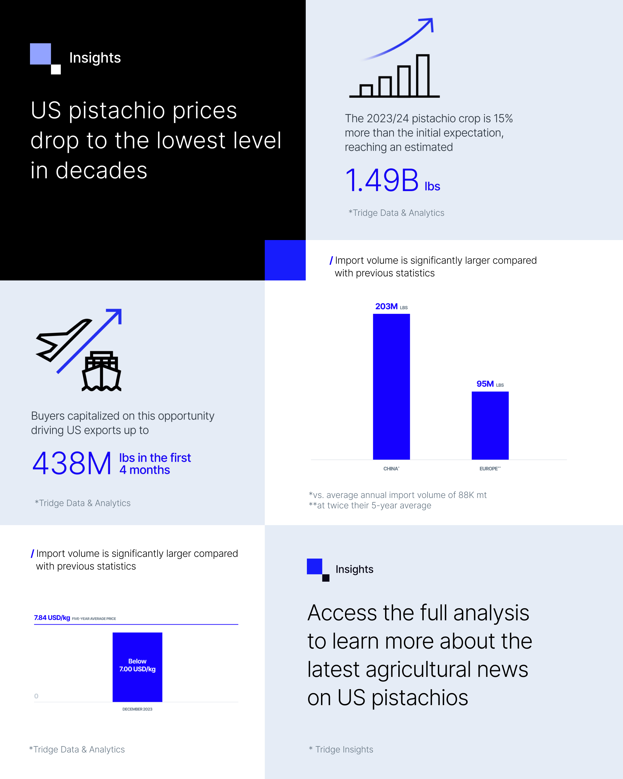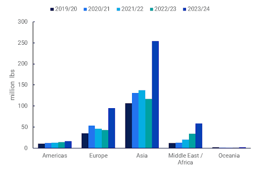 These rock-bottom prices triggered a surge in pistachio exports, with buyers seizing the opportunity to stock up on pistachios during this period of exceptional affordability. Early in the 2023/24 period, exports from the US experienced a notable increase to all regions.