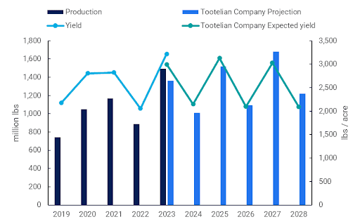 The variation in the cycle has become more pronounced in the US. This is mostly due to climatic factors, leading to a poor crop in 2022, a large crop in 2023, and the high possibility of a poor crop in 2024. In 2023, the American Pistachio Growers commissioned the Tootelian Company to make long-term production projections based on pistachio areas planted and expected yields as these trees mature. While the production aggregate over the following years might closely align with these estimates, averaging around 1.3 million lbs annually, the variation between on- and off-years might be more pronounced than in these projections.