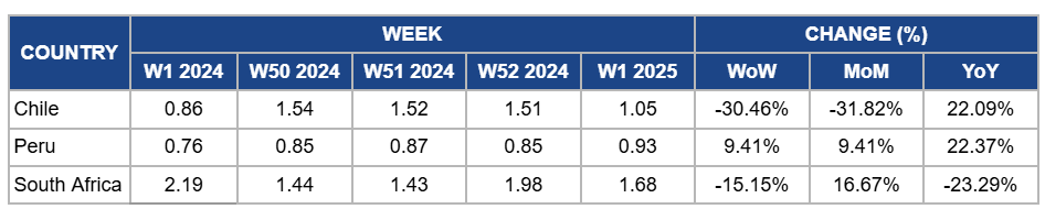 In Peru, grape prices increased by 9.41% WoW and MoM to USD 0.93/kg in W1, reflecting a 22.37% YoY increase. This price rise is due to improved production quality driven by favorable weather conditions, which enhanced the overall fruit quality, leading to stronger demand. While better weather contributed to higher yields and led to potential price reductions due to increased availability, the price increase is primarily due to the improved quality of the grapes, which has enhanced their market value. The southern regions of Peru, which contribute significantly to exports, are expected to see a volume recovery for the 2024/25 season, and this higher-quality produce is likely to command premium pricing.