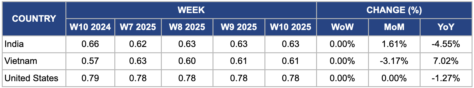 In W10, Vietnamese rice prices remained unchanged WoW but declined 3.17% MoM to USD 0.61/kg, marking the lowest level in the region since Dec-24. The Vietnam Food Association (VFA) reported a sharp drop in the prices of 5% broken, 25% broken, and 100% broken rice, significantly impacting farmers, traders, and warehouses. The decline is primarily due to India lifting export restrictions, increasing global supply, and higher rice production in Vietnam, Thailand, and Pakistan. The Ministry of Agriculture and Environment estimates Vietnam’s total rice cultivation area at 7.03 million ha in 2025, with an expected output of 43.14 mmt.