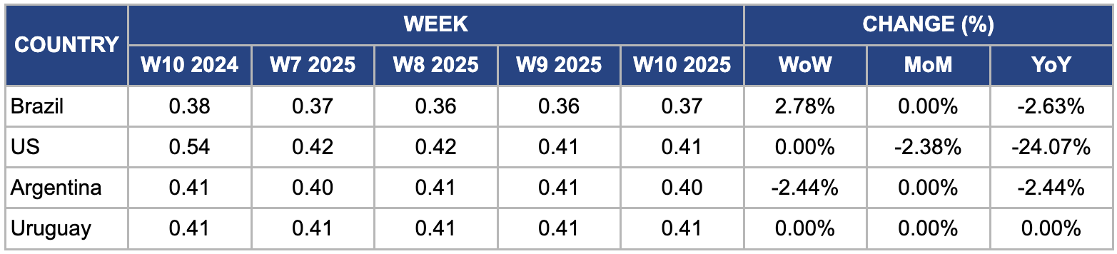 Uruguay's soybean prices held steady at USD 0.41/kg in W10, supported by key factors such as favorable market conditions and the expansion of planting area. For MY 2024/25, Uruguay's soybean planting area is projected to reach 1.3 million ha, a 19% increase from the five-year average. This growth is attributed to late-season soybean planting as producers brace for potential challenges from the La Niña weather pattern. The USDA forecasts Uruguay's soybean production for 2024/25 at 3.4 mmt, up from 3.2 mmt in the previous year due to favorable weather conditions.