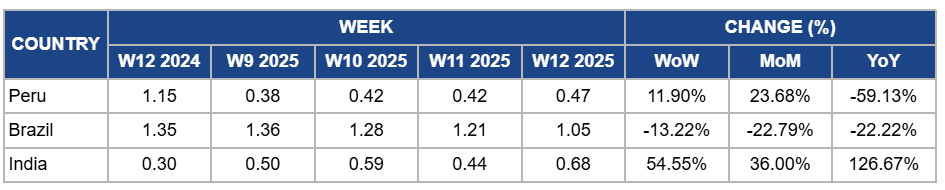 In W12, mango prices in Peru increased by 11.90% week-on-week (WoW) to USD 0.47 per kilogram (kg), marking a 23.68% month-on-month (MoM) rise. This upward trend is primarily due to targeted marketing strategies implemented by the Peruvian Ministry for the Development of Agriculture and Irrigation (MIDAGRI) to support mango producers in Lambayeque, leading to increased demand. Additionally, a commercial agreement between the Earth Fruits Organics Producers Association and the Agroandino processing plant in San Pablo, Cajamarca, secured the sale of 420 tons of Kent mangoes for dehydration. However, year-on-year (YoY) prices declined by 59.13%, reflecting a substantial increase in production. The 2024/25 season is expected to yield approximately 340 thousand tons, a 55% YoY rise, due to improved climatic conditions and expanded use of irrigated crops, resulting in a higher overall market supply.