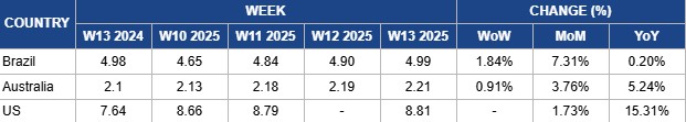 In W13, US lean beef (92% to 94% lean) reached a record average of USD 8.81/kg, marking the highest wholesale price. This price reflects a 1.73% MoM increase and a significant 15.31% YoY rise, driven by tightening domestic supply amid a shrinking US cow herd. According to the United States Department of Agriculture (USDA), the total cattle and calf inventory stood at 86.7 million heads as of January 1, 2025, down 0.6% YoY, marking the sixth consecutive year of herd contraction. As a result, US beef production in 2025 is expected to decline by 4.4% YoY, with per capita consumption predicted to fall by 2.68% YoY to 58 pounds (lbs) per person. The price surge has been further exacerbated by trade uncertainties, including higher US import tariffs and retaliatory measures from Canada, the European Union (EU), China, and Mexico.