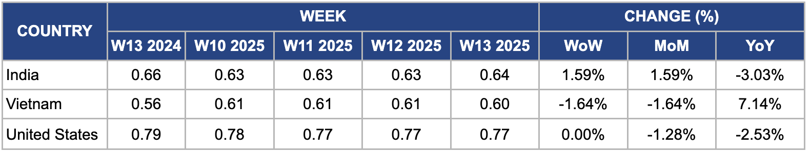 In W13, US rice prices remained stable WoW but declined 1.28% MoM and 2.53% YoY to USD 0.77/kg. The price drop was primarily driven by increased domestic supply, as US rice production for the 2024/25 season rose by 2% YoY to 222.1 million hundredweight (cwt), with long-grain rice output increasing by 12%. Moreover, record-high rice imports, especially from Thailand, reached 47 million cwt, further swelling domestic availability. Export demand also weakened, with US rice facing stiff competition from lower-cost suppliers in South America and Asia. Meanwhile, global rice prices declined due to abundant harvests and the removal of India’s rice export restrictions, exerting further downward pressure on US market prices.
