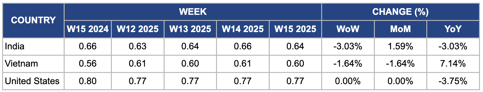 In W15, United States (US) rice prices remained stable WoW but declined by 3.75% YoY to USD 0.77/kg. The YoY decline was primarily driven by higher production levels in the 2024/25 crop year, with total US rice production estimated at approximately 8.6 mmt, a 3% YoY increase compared to the previous year. This increased production boosted domestic supply and alleviated price pressures. Moreover, a drop in global rice prices, particularly from major exporters like India and Thailand, led to more competitive pricing on the international market, making US rice less attractive. While domestic demand remained steady, the drop in export opportunities and lower global prices contributed to the YoY price decrease.