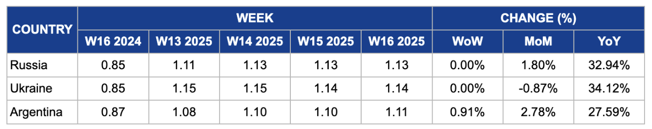 In W16, sunflower oil prices in Ukraine held steady at USD 1.14/kg week-on-week (WoW), despite recent increases in euro-denominated prices. This stability in USD terms is largely due to a weaker USD to EUR exchange rate, which offset local price movements. MoM prices dipped slightly by 0.87%, reflecting a modest market correction amid rising export volumes and processor adjustments. The sharp 34.12% YoY increase underscores persistent tight domestic supply, bolstered by strong early-April sunflower oil exports, which rose 10%. However, the recent price softening comes as high raw sunflower seed costs erode processing margins, prompting a shift toward soybean crushing. These dynamics, alongside broader global macroeconomic pressures and falling crude oil benchmarks, have tempered bullish sentiment in the short term despite firm long-term fundamentals.