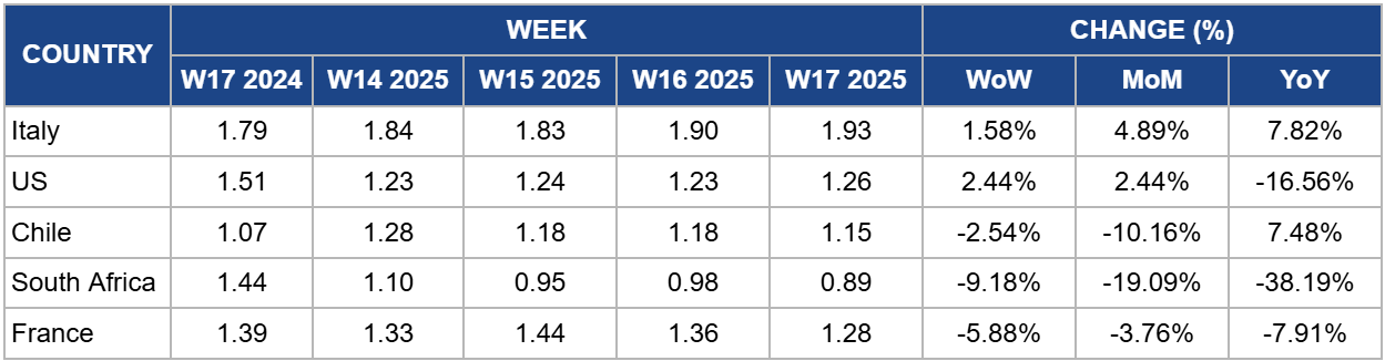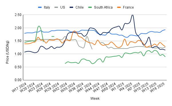 In W17, Chile’s apple prices declined to USD 1.15/kg, down 2.54% WoW and 10.16% month-on-month (MoM). The price drop is linked to seasonal harvest peaks in Apr-25, which boosted domestic supply, alongside strong regional competition from other Southern Hemisphere exporters. Furthermore, higher volumes have further contributed to downward price pressure. If export demand does not keep pace with supply, prices may remain soft in the short term, though a later seasonal taper in supply or strong overseas interest could stabilize or lift prices.