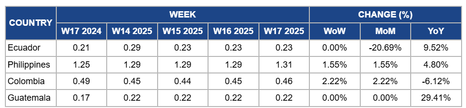 In W17, Guatemala's banana prices remained steady at USD 0.22/kg, with no WoW or MoM change. This stability is due to consistent export demand from key markets, particularly North America and Europe, and stable supply conditions. The 29.41% YoY price increase is due to higher input costs, such as fertilizers and labor, and ongoing efforts to enhance quality standards, which have contributed to overall price stability and gradual upward trends in the market.