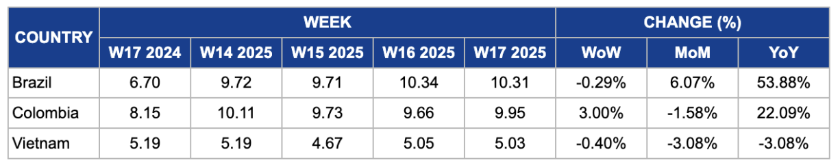 In W17, Colombia’s coffee price saw a MoM drop of 1.58%, reflecting a market correction after prices peaked in W14. This adjustment is indicative of market stabilization, as prices temporarily overadjusted, and competitive pressures and shifts in supply-demand dynamics played a role in the slight decrease. However, the price remained higher with a 3% WoW increase, highlighting a bounce-back and market adjustment. Additionally, the price rose significantly by 22.09% YoY, driven by Colombia's recovery in coffee production and its efforts to diversify exports, especially to Europe, mitigating the impact of US tariff uncertainties and sustaining long-term price growth.