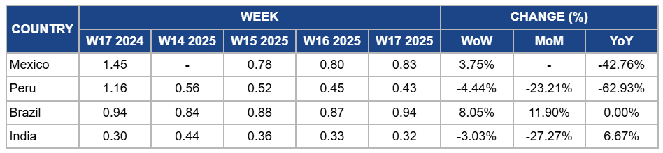 In W17, Peru's mango prices dropped by 4.44% WoW to USD 0.43/kg, with a 23.21% month-on-month (MoM) decline and a 62.93% YoY fall due to the gradual conclusion of the Peruvian mango season, which concluded with significantly higher production volumes than last year. The Peruvian mango season typically begins in October and concludes around April, with peak harvesting occurring between December and March. The favorable weather during the 2025 campaign, following the challenges of the previous El Niño-affected season, led to an abundant supply in the market, putting downward pressure on prices. As the Peruvian season ended, competition from increasing Mexican production, particularly of the Kent variety, and preparations for Brazilian mango exports further weighed on market prices.
