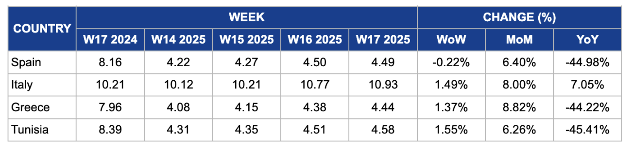 In W17, Italy’s olive oil price reached USD 10.93/kg, increasing 1.49% WoW, 8.00% MoM, and 7.05% YoY. These gains are driven by persistent domestic supply shortages, as Italian-origin EVOO stocks dropped sharply by 35.5% YoY due to severe climatic stress—particularly drought and heatwaves in key producing regions like Puglia and Sicily—and the alternate-bearing cycle that naturally curbs output. Despite lower domestic production, firm international demand has kept prices elevated. Additionally, Italy has ramped up olive oil imports by 53% within the EU to offset supply gaps, with over 475,000 tons expected to be imported, underscoring its growing reliance on external sources, particularly Spain.