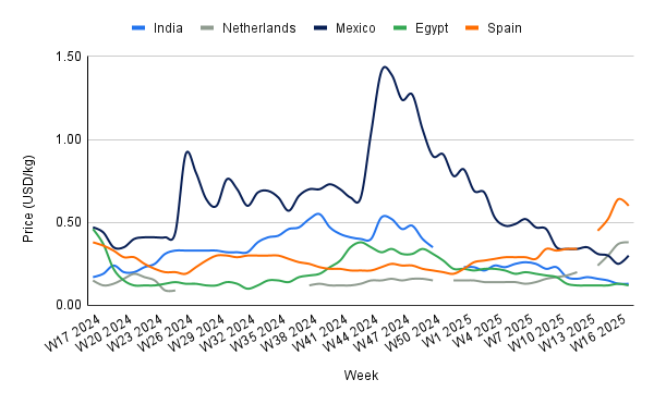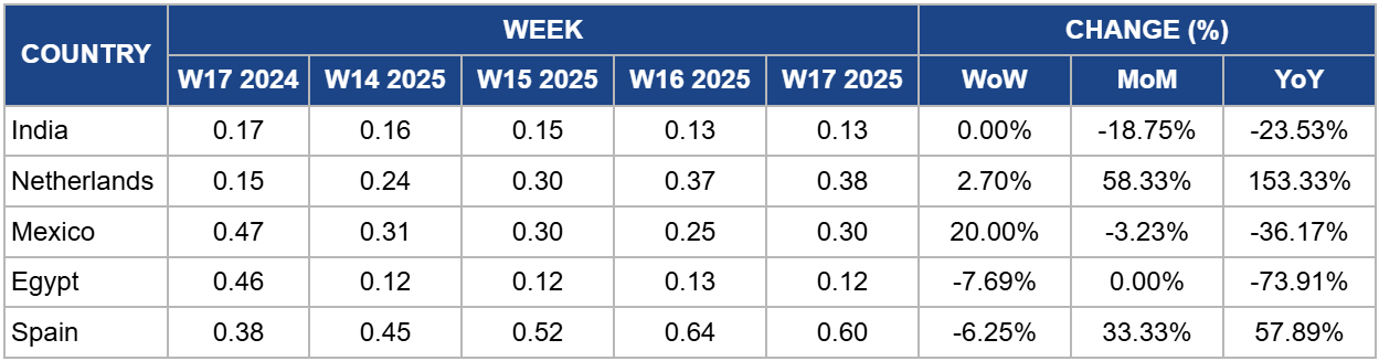 In W17, Mexico’s onion prices rose by 20% WoW to USD 0.30/kg, though still down 36.17% YoY from USD 0.47/kg. The recent uptick reflects short-term supply adjustments, but broader market conditions remain weak due to regional oversupply. In Sinaloa, an important production hub, the excess output of onions has depressed prices. If this trend continues, onion prices may remain under pressure despite temporary increases, especially in the absence of stronger domestic demand or export relief. Elevated plantings following last year’s favorable conditions and water concerns further heighten the risk of prolonged price volatility.