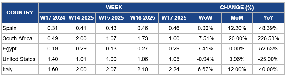 In W17, orange prices in Italy rose by 6.67% WoW to USD 2.24/kg, reflecting a 12% MoM increase and a significant 40% YoY increase. The price surge is due to reduced supply from key producing regions in Italy, particularly from Sicily, where weather challenges such as irregular rainfall and unseasonably warm temperatures have affected yields. Additionally, stronger export demand, especially from European markets and the Middle East, has pushed prices higher. However, the sustainability of these price increases is uncertain. As the harvest season nears its end in late spring and early summer, supply is expected to decrease, which could put downward pressure on prices. Furthermore, the upcoming harvests from competing countries like Spain may lead to more competition, further affecting the price levels.