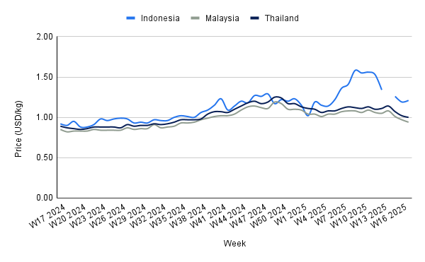 In W17, Thailand’s palm oil prices declined to USD 1.00/kg, down 1.96% WoW and 12.28% MoM decrease from USD 1.14/kg. The continued price weakness reflects broader agricultural pressures, as Thai farmers face rising cultivation costs alongside falling commodity prices. Calls for government intervention to stabilize farm incomes highlight the risk of further supply disruptions if producer margins continue to erode. Unless domestic support measures are introduced or regional demand strengthens, palm oil prices in Thailand may remain under downward pressure, particularly as global production seasonally increases and competition from lower-priced alternatives persists.