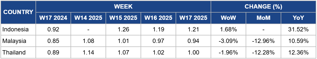 Malaysia's palm oil prices declined to USD 0.94/kg in W17, representing a 3.09% WoW drop and a 12.96% month-on-month (MoM) decline from USD 1.08/kg. This recent price correction is attributed to sluggish global sentiment and rising stockpiles. However, demand fundamentals appear poised to strengthen, potentially stabilizing prices in the near term.