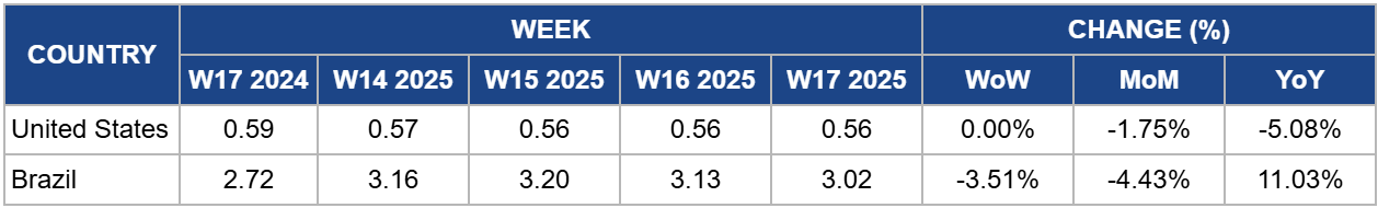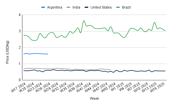 In W17, Brazil's peanut prices fell to USD 3.02/kg, a 3.51% WoW decline, though still 11.03% higher YoY from USD 2.72/kg. This decrease reflects strategic export pricing amid the mid-harvest phase, which is delivering strong volumes and quality as of W17. However, persistent rainfall threatens to delay harvest progress and may reduce final output. The current price dip is largely tied to Brazil's efforts to regain international market share, particularly outside Europe, following a weak 2024 crop. This has led exporters to adopt aggressive pricing, increasing competitive pressure on suppliers like the US and Nicaragua. If adverse weather persists and disrupts harvest completion, reduced supply could drive prices higher in the medium term, counteracting short-term declines and reshaping global peanut trade dynamics.