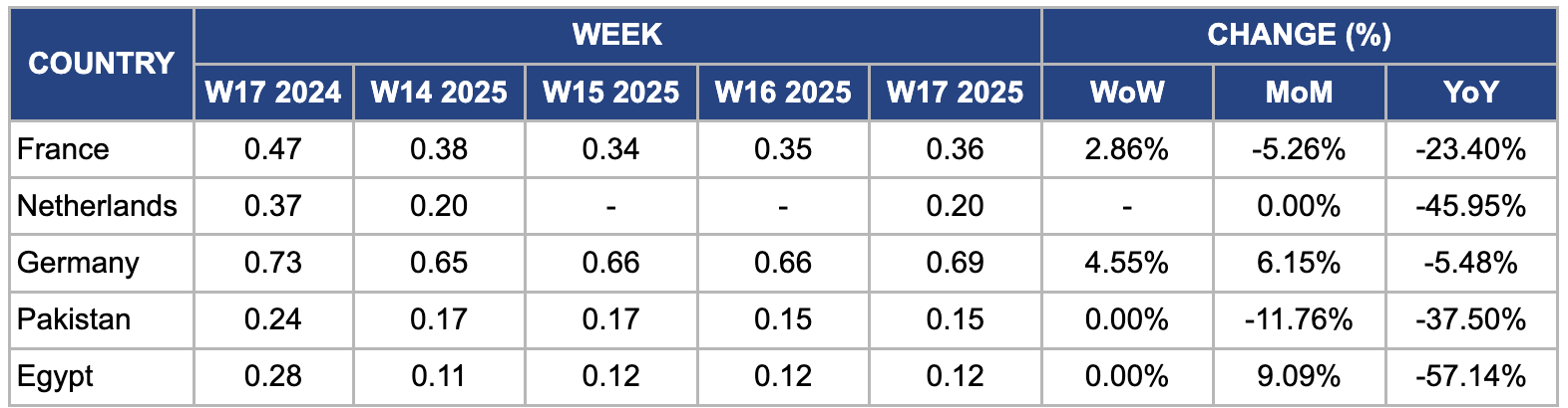 In W17, Egypt's potato prices remained stable WoW but saw a 9.09% MoM increase, reaching USD 0.12/kg. This price rise is due to strong export demand, driven by expanded access to new markets such as Tajikistan and the Balkans and renewed demand in traditional markets like Spain and the Gulf. Moreover, exports to Russia have increased, supported by reduced customs duties to curb food inflation. Egypt's potato exports will grow by 10 to 15% YoY in 2025.
