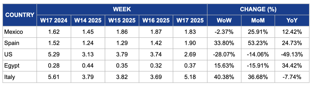 Mexico's strawberry prices decreased slightly by 2.37% week-on-week (WoW) to USD 1.83 per kilogram (kg) in W17, primarily due to the conclusion of the peak production season, which typically runs from December to April, leading to a reduction in supply. However, prices increased by 25.91% month-on-month (MoM) and 12.42% YoY, driven by factors such as increased demand from local festivals and holidays, including the third annual Strawberry Festival in Nogales, and a delayed peak season resulting in extended availability into mid-Mar-25.