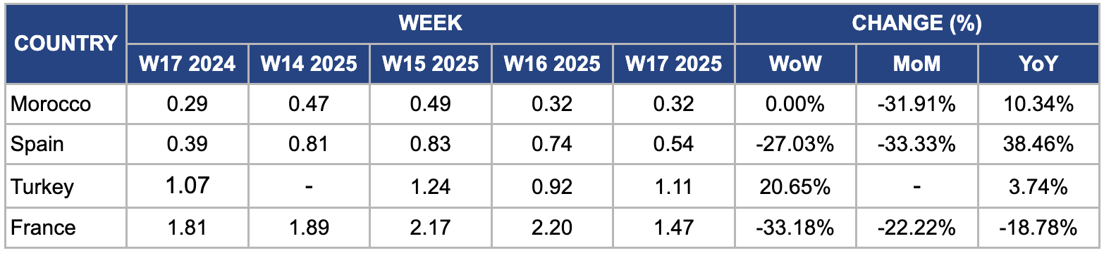 In W17, Morocco's tomato prices fell sharply by 31.91% month-on-month (MoM) to USD 0.32 per kilogram (kg), driven by the government’s decision to implement strict export quotas that slashed daily tomato shipments to Europe by 90% for round and grape varieties. This move aimed to boost domestic availability and curb price inflation, particularly ahead of holidays, when food demand traditionally rises. As a result, a surge in local supply significantly pulled prices down, highlighting the immediate impact of policy interventions on market dynamics.