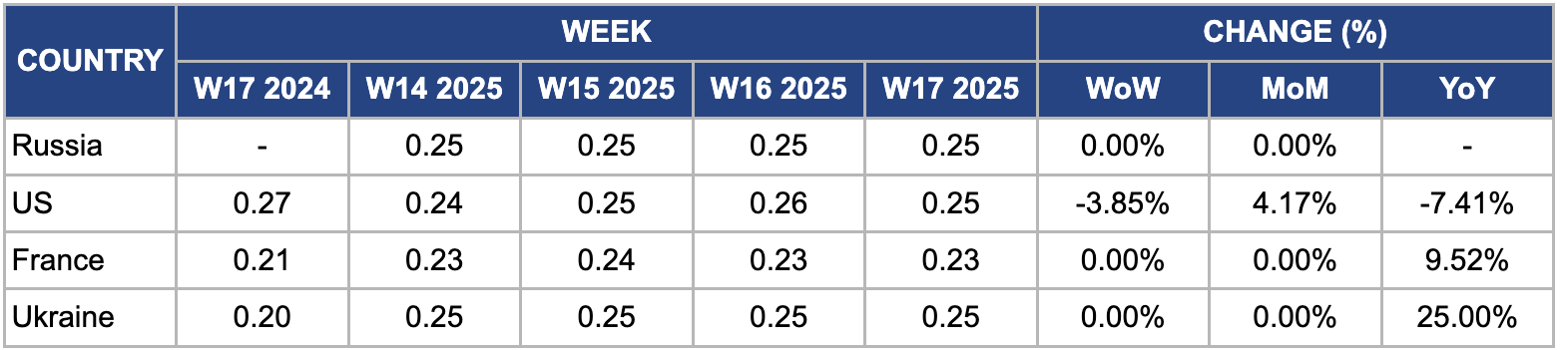 Ukrainian wheat prices remained unchanged WoW and MoM in W17. However, prices surged by 25% YoY, rising to USD 0.25/kg from USD 0.20/kg in W17 2024 due to tight supply. According to the USDA, the wheat harvest for MY 2025/26 will be 17.9 mmt, the lowest in 13 years and 23% lower than the previous year's harvest. This decline is due to dry soils during the sowing season and reduced crop areas due to low profitability.