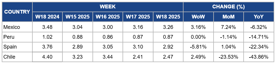 In W18, Mexico's avocado prices increased by 3.16% week-on-week (WoW) to USD 3.26/kg, with a 7.24% month-on-month (MoM) rise driven by reduced supply following forest fires in Nayarit that destroyed avocado orchards, tightening availability and pushing prices upward. However, there is a 6.32% YoY drop due to the appreciation of the Mexican peso, which has made exports more expensive and less competitive in international markets, leading to decreased demand and contributing to the YoY price decline.