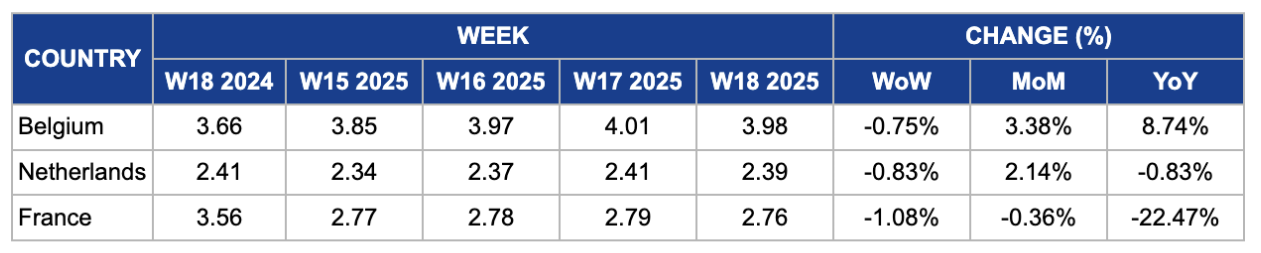 In W18, Belgium's milk price was USD 3.98/kg, reflecting a slight 0.75% week-on-week (WoW) drop as supply begins to stabilize, although it remains tight. Despite this, MoM and year-on-year (YoY) prices increased by 3.38% and 8.74%, respectively, due to ongoing tight supply conditions. High input costs, including feed, energy, and labor, coupled with labor shortages and an aging farming population, continue to limit production expansion. Strong global demand, particularly from emerging markets, is supporting export flows and keeping upward pressure on prices, ensuring a continued upward trend despite the minor WoW price drop.