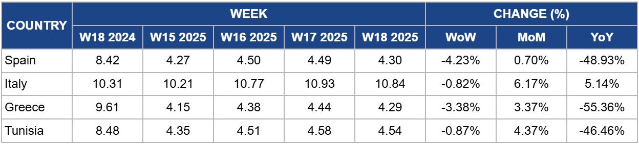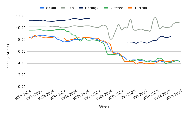 Spain's wholesale olive oil prices have experienced a significant decline, falling to USD 4.30 per kilogram (kg) in W18, marking a 4.23% decrease week-on-week (WoW) and a 48.93% YoY drop from USD 8.42/kg. While recent months have seen some stability following previous price surges caused by drought and production shortages, the market faces new uncertainty due to the potential imposition of 20% tariffs by the US on European products, including olive oil.