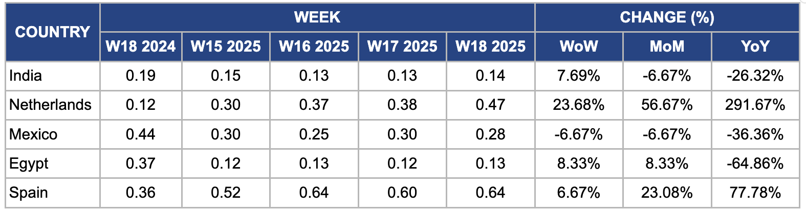 In W18, onion prices in the Netherlands jumped to USD 0.47/kg from USD 0.38/kg, marking a 23.68% WoW and 56.67% month-on-month (MoM) increase. The surge stemmed from tight domestic supply and strong export demand. Heavy autumn rains during the 2023/24 season significantly damaged harvests in key producing areas such as Zeeland and Flevoland, slashing marketable stocks by nearly 25% below the five-year average. At the same time, rising shipments to West Africa and Southeast Asia, coupled with an 18% year-on-year (YoY) increase in energy and storage costs, exerted additional upward pressure. If strong export flows persist and domestic availability remains constrained, high prices are likely to continue through mid-2025.