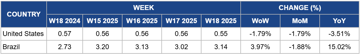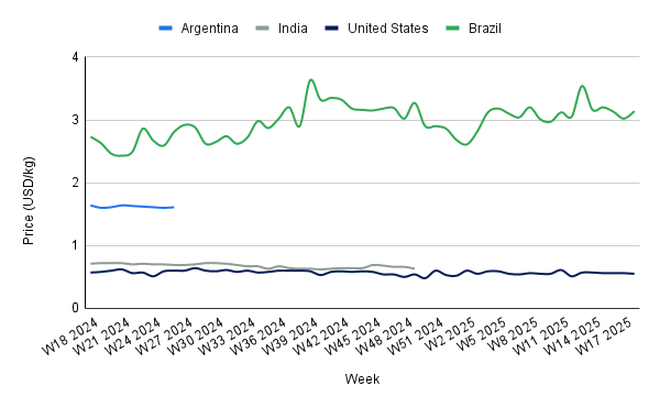 US peanut prices declined to USD 0.55/kg in W18, down 1.79% both week-on-week (WoW) and month-on-month (MoM), reflecting early signs of potential oversupply as planted acreage expands. The projected rise in peanut acreage to 1.95 million acres, up 11% from 2024, is driven by comparatively weak prices in other row crops and continued profitability in peanuts, especially in irrigated systems. Georgia's 12% YoY increase leads the surge, with similar gains in other Southeastern states. However, if favorable weather results in strong yields, market pressures may intensify due to carryover concerns.