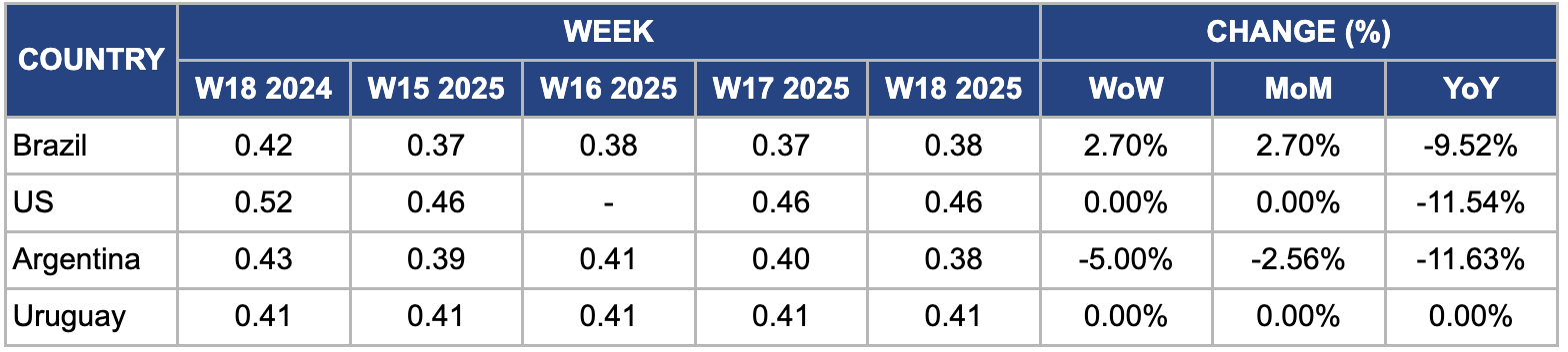 In W18, Uruguay's soybean prices remained steady WoW at USD 0.41/kg, reflecting a balance between recovering domestic production and subdued global market conditions. Following a severe drought in 2023 that slashed output to 700 thousand metric tons (mt), Uruguay's 2024/25 soybean harvest rebounded significantly, with production estimated at 3.1 mmt. This recovery was supported by favorable weather conditions and improved yields, bringing production levels closer to the five-year average. Despite the production rebound, international soybean prices have been under pressure due to record harvests across South America, particularly in Brazil, leading to an oversupply internationally.