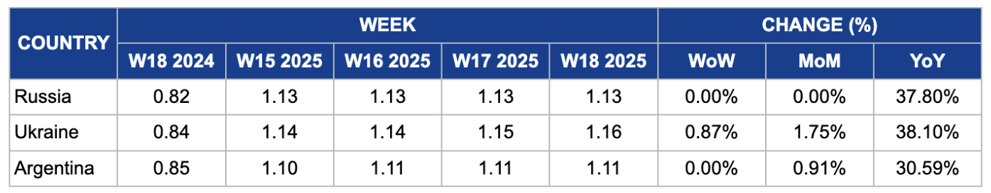 In W18, Ukrainian sunflower oil prices rose to USD 1.16/kg, reflecting a WoW increase of 0.87%, a MoM rise of 1.75%, and a YoY surge of 38.10%. These increases are primarily driven by a tight domestic sunflower seed supply and robust export demand, particularly from India and Iraq, which has supported elevated price levels. High processing costs have further contributed to upward price pressure. However, the market faces mixed sentiment as rising raw material prices continue to erode processing margins, while external factors such as falling crude oil prices, and a weaker USD, have slightly limited momentum.