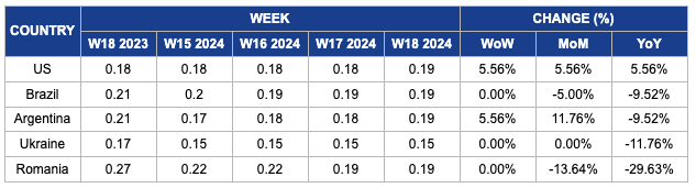 In W18, Argentina's Buenos Aires Grain Exchange drastically reduced its production estimate by 3 mmt, citing issues like leafhopper outbreaks and climatic complications during harvest. Additionally, available maize stood at USD 0.18/kg in the domestic market, marking a 5.56% WoW increase.