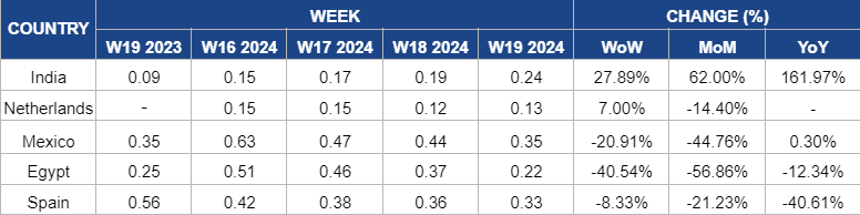 Over the past month, Egyptian onion pricing has fluctuated from USD 0.51/kg in W16 to USD 0.22/kg in W19, representing a 56.86% drop MoM. W19 2024 pricing is only 12.34% lower than pricing at the same time last year. Additionally, WoW pricing has dropped by 40.54%. The drop in prices can be attributed to efforts to incentivize exports after the export ban was lifted in April.
