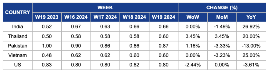 The wholesale price of milled white long rice increased 2.44% WoW to USD 0.80/kg in W19 from USD 0.82/kg in W18. Similarly, YoY prices dropped 3.61%. This decline is due to increased United States (US) rice production area, which rose to approximately 2.9 million acres in 2023 after two consecutive years of decline.