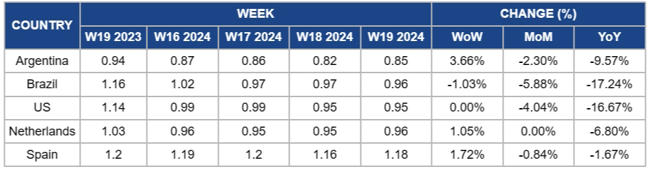 In W19, soybean oil prices in the US remained unchanged from W18 at USD 0.95/kg. However, in this week, Jul-24 shipments futures in Chicago surged by 3.2% to USD 980/kg due to a potential production loss in Brazil.