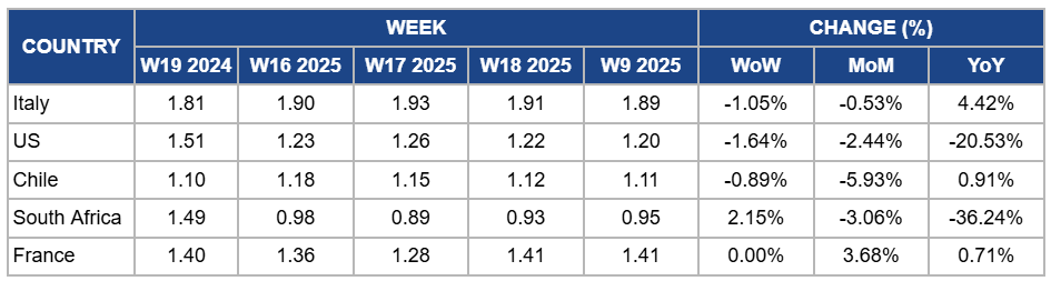 In Italy, apple prices dropped by 1.05% week-on-week (WoW) to USD 1.89/kg in W19, with a 0.53% month-on-month (MoM) decrease due to sluggish local demand and increased availability of late-season varieties, which exerted downward pressure on prices. However, YoY prices increased by 4.42% due to a 16% reduction in national apple supply compared to the previous year, particularly affecting varieties like Fuji and Golden Delicious. Additionally, steady demand for premium and organic apples in local and export markets has contributed to maintaining higher price levels compared to 2024.