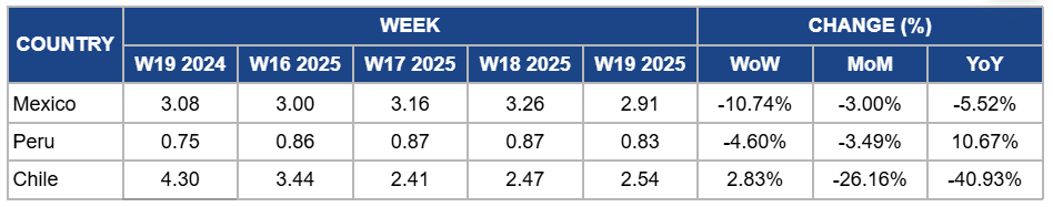 Avocado prices in Peru declined by 4.60% WoW to USD 0.83/kg in W19, marking a 3.49% MoM decrease due to strong early-season supply, which typically begins around March to April and ramps up toward its peak export period in June and July. As the Peruvian harvest gains momentum and volumes build, increased availability has exerted downward pressure on prices. However, YoY prices increased by 10.67% due to tighter global avocado supplies during the same period last year, influenced by adverse weather and logistical challenges, which had previously elevated prices.