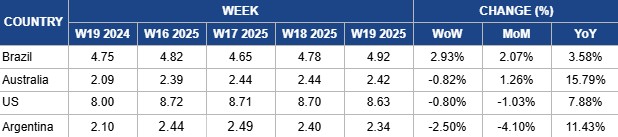 Australia’s National Young Cattle Indicator averaged USD 2.42/kg in W19, showing a 0.82% WoW decline but marking a 1.26% MoM rise and a 15.79% YoY increase. According to Meat and Livestock Australia (MLA), the cattle market weakened over the week, with all major indicators recording declines from the previous week. Driven by a substantial supply of cows, a record yarding at Wagga’s May 5 sale pushed the national processor cow indicator up by 2.5 thousand heads, although rising supply exerted downward price pressure. In contrast, the national feeder steer indicator remained firm, supported by stable pricing at key New South Wales saleyards, including CTLX Carcoar, Gunnedah, and Tamworth, despite higher volumes.