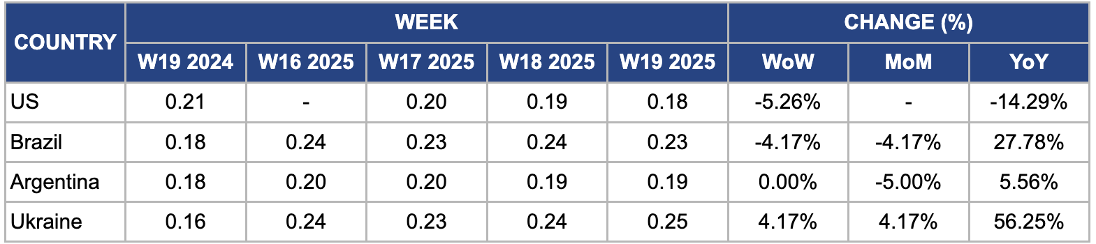 In W19, Ukrainian wholesale maize prices rose 4.17% WoW, 4.17% MoM, and 56.25% YoY, reaching USD 0.25/kg. Several key factors contributed to this price surge, including reduced global maize availability and ongoing challenges within Ukraine's domestic supply chain. The country's 2025 maize harvest will be lower, while export demand, particularly from the European Union (EU), remains high due to the global supply shortage caused by production issues in other major maize-producing regions such as Argentina and Brazil. By May 5, Ukraine had exported 255 thousand mt of maize, and May-25 will be an active month for trade. However, prices may drop in the coming weeks as Ukrainian maize becomes more expensive than US corn in certain markets. For example, in Spain, US corn is cheaper by USD 20 to 25/mt, leading Spanish importers to favor American corn.