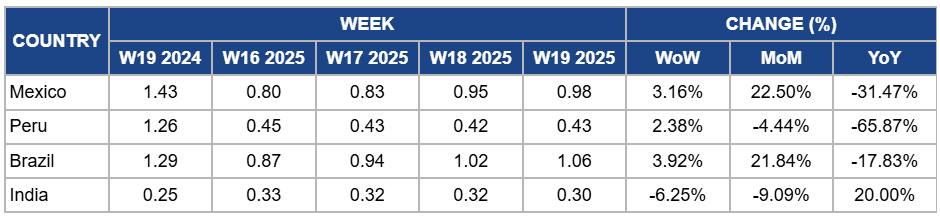 Brazil's mango prices increased by 3.92% WoW to USD 1.06/kg in W19, with a 21.84% MoM rise, due to a temporary shortage of the Tommy Atkins variety, which has been scarce in recent weeks, driving up domestic prices. However, YoY prices declined by 17.83% due to a 33% increase in production for the 2024/25 season, resulting from favorable climatic conditions and abundant rainfall. This oversupply has exerted sustained downward pressure on prices, further intensified by heightened competition in key export markets such as Europe and the US, particularly from major producers like Peru and Mexico.